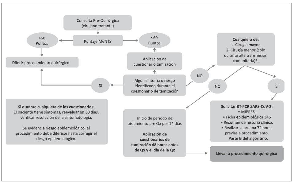 Figura. Parte A. Evaluación del paciente apto para cirugía electiva esencial en el marco de la pandemia de COVID-19.