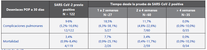 Tabla 1. Resultados de los pacientes operados con una prueba previa positiva para SARS‐CoV‐2/COVID-19 (COVIDSurg-Cancer collaborative)