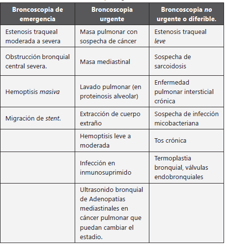- Se realizará broncoscopia en casos que se vea comprometida la vida del paciente (ver tabla). Así mismo, eventualmente en pacientes con un posible diagnóstico alternativo en el que la broncoscopia deba realizarse con urgencia y en el que el procedimiento permita cambiar rápidamente conductas terapéuticas que beneficien la vida del paciente.