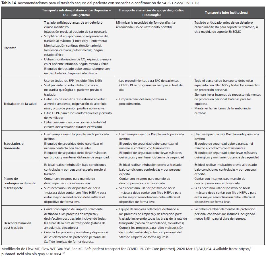 Tabla. Recomendaciones para el traslado seguro del paciente con sospecha o confirmación de SARS-CoV2/COVID-19 Transporte intrahospitalario entre Urgencias – UCI - Sala general Transporte a servicios de apoyo