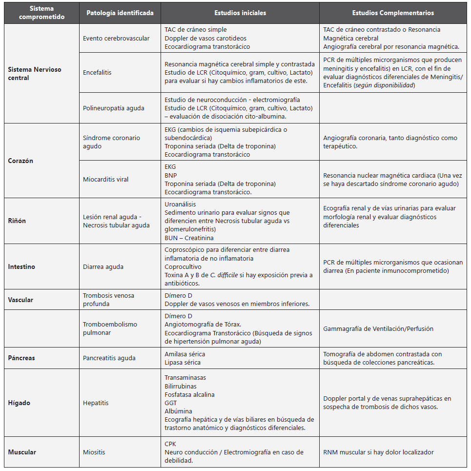 - Se recomienda de acuerdo con el cuadro clínico y la gravedad del paciente con infección por SARS-CoV-2/ COVID-19 grave con indicación de manejo hospitalario, solicitar estudios diagnósticos con el fin de establecer el compromiso multisistémico de esta entidad según contexto clínico compatible. Los estudios que se recomiendan se encuentran en la tabla No
